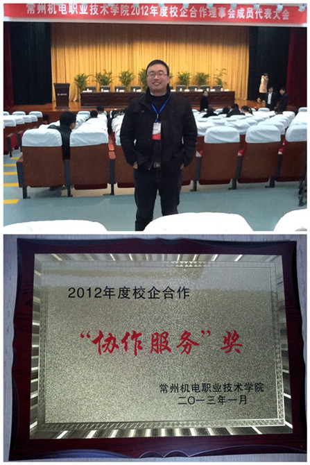 1月27日,我公司仲旭峰副總經(jīng)理應邀參加常州機電職業(yè)技術學院2012年度校企合作理事會代表大會。常州市人民政府副秘書長孫如山、常州市教育局黨委書記潘建中、武進區(qū)副區(qū)長王明昌等一同出席了會議,并為2012年度合作優(yōu)秀的企業(yè)頒發(fā)了相關獎項。