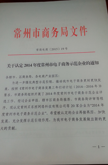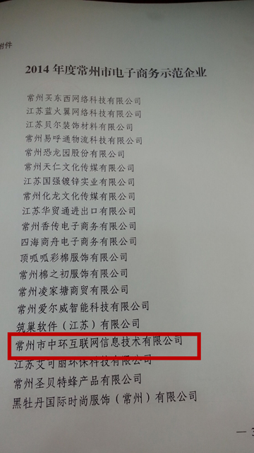 常州中環(huán)互聯(lián)網(wǎng)2015年開年即獲得“常州市電子商務(wù)示范企業(yè)”,這樣的榮譽(yù)是對中環(huán)過去一年工作的肯定,同時(shí)也是中環(huán)2015年工作的不竭動(dòng)力。