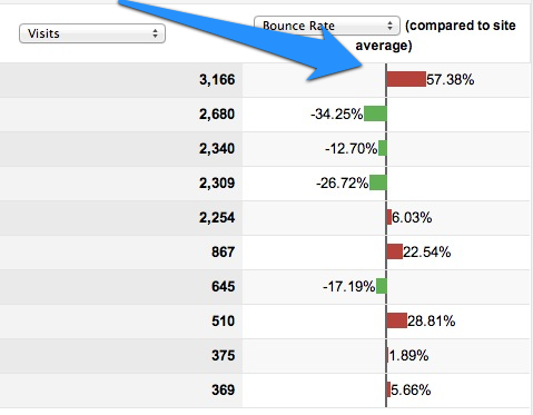 上圖中,中間的軸就是網(wǎng)站的平均跳出率, 紅色代表的是高過(guò)平均值,綠色是低過(guò)平均值。所以紅色不好,綠色好。和美國(guó)股市一樣的。如果你仔細(xì)看會(huì)發(fā)現(xiàn)推送流量最多的網(wǎng)站也就是第一個(gè),在一個(gè)月內(nèi)輸送了3166個(gè)Ip,聽(tīng)起來(lái)不錯(cuò)吧?但是他的跳出率比平均值高出57.38% 。很明顯這個(gè)流量不給力,如果你做了轉(zhuǎn)換率設(shè)置,你也可以看出這個(gè)流量的轉(zhuǎn)換率一定也是很低的。