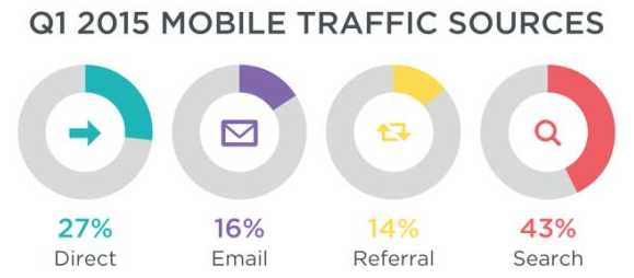 讓網(wǎng)站對移動端更友好,不僅對谷歌和消費者來說是件好事——網(wǎng)站運營方同樣會受益。對于專門針對移動設(shè)備優(yōu)化的網(wǎng)站來說,搜索會將大量用戶吸引至移動端站點,為網(wǎng)站的收入做出重大貢獻。根據(jù)品牌研究機構(gòu) Branding Brand 對 100 家熱門移動網(wǎng)站的 調(diào)查,2015 年第一季度,搜索占到所有智能手機流量的近一半,比 2014 年第四季度增長 5%。此外,在針對智能手機進行優(yōu)化的網(wǎng)站當(dāng)中,自生搜索(organic search)占到其營收總額的 25%。