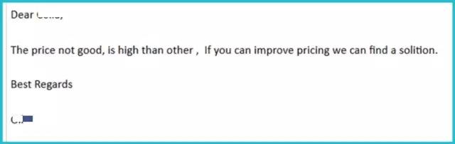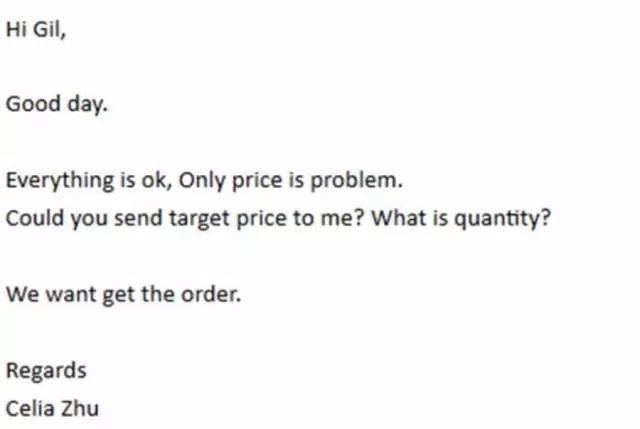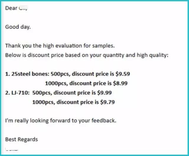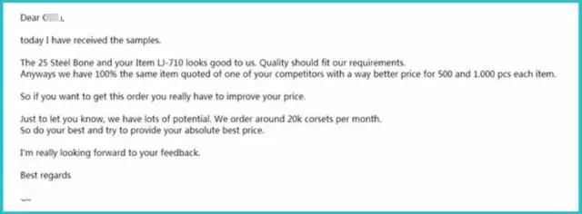 在這封郵件里,可以看到客戶對于樣品的質(zhì)量很滿意,但客戶很精明,說他們有收到其他供應(yīng)商更好的價格,同時還拋出了他每月的預(yù)訂數(shù)量,給買方畫了一個大餅。