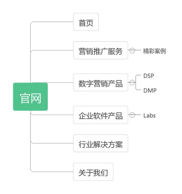 回歸到我們的官網(wǎng)本身,需要對(duì)功能進(jìn)行優(yōu)先級(jí)劃分。綜合此次改版目標(biāo):突出營(yíng)銷和豐滿產(chǎn)品線,因此把營(yíng)銷單獨(dú)作為一個(gè)菜單板塊,放置在首頁(yè)之后,把公司介紹放在最后。其次,根據(jù)關(guān)鍵詞的屬性聚合出分類,把DSP,DMP,ADX,SSP聚合成數(shù)字營(yíng)銷產(chǎn)品;把Labs歸入到軟件產(chǎn)品同樣有技術(shù)研究屬性的功能下;把案例歸入到營(yíng)銷推廣服務(wù)下。最后提煉出來(lái)的產(chǎn)品框架如下: